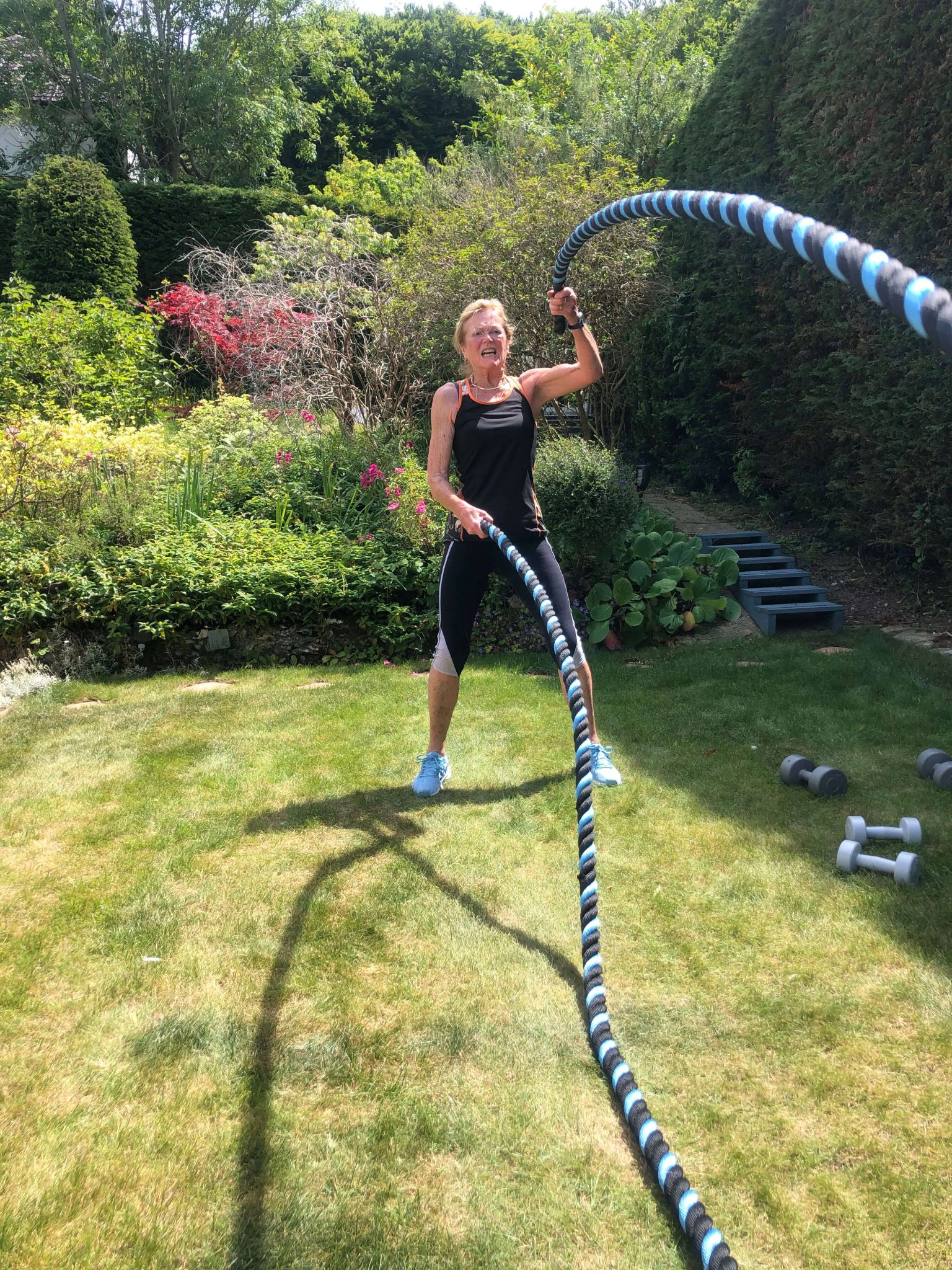 Jenny Cooper, pictured on the battle ropes, will be EIGHTY this May 2023 – proof that age is not a limit to being active!